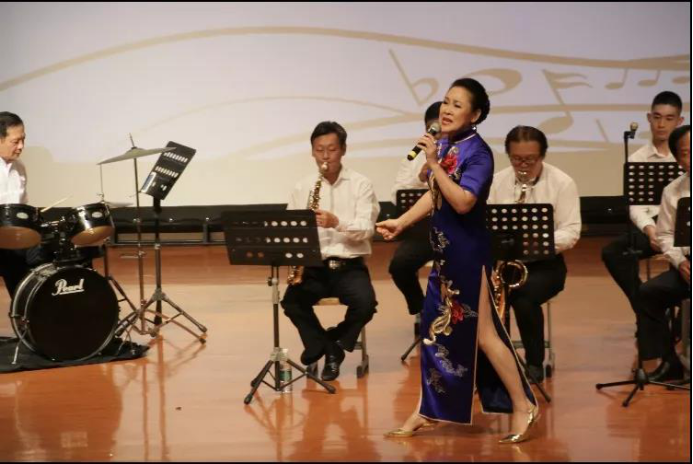 最值得期待的是纪晓兰女士的出场,她的出场,使音乐会的气氛达到了高潮。由她独唱的《苏州河边》《如果没有你》等歌曲让人回味无穷。特别是《苏州河边》这首歌,歌声与歌词融合在了一起,让人感受到歌曲的意境就像太湖—苏州河—黄浦江—东海那样层层递进,较之原唱,别有韵味,同样优美好听。