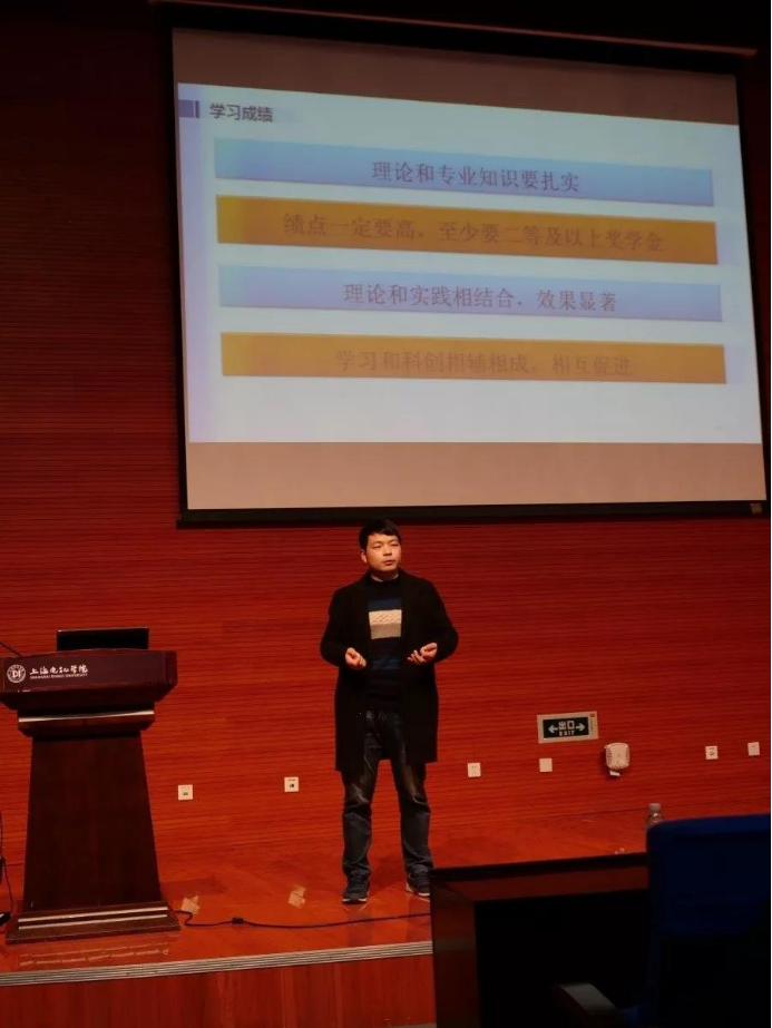 紧接着王顺利为我们讲述了“我的大学,我的科创”。简单为我们介绍了科创四大金刚:项目,专利,比赛,论文;大学应该如何度过;并分享了他自己的大学是如何度过的。