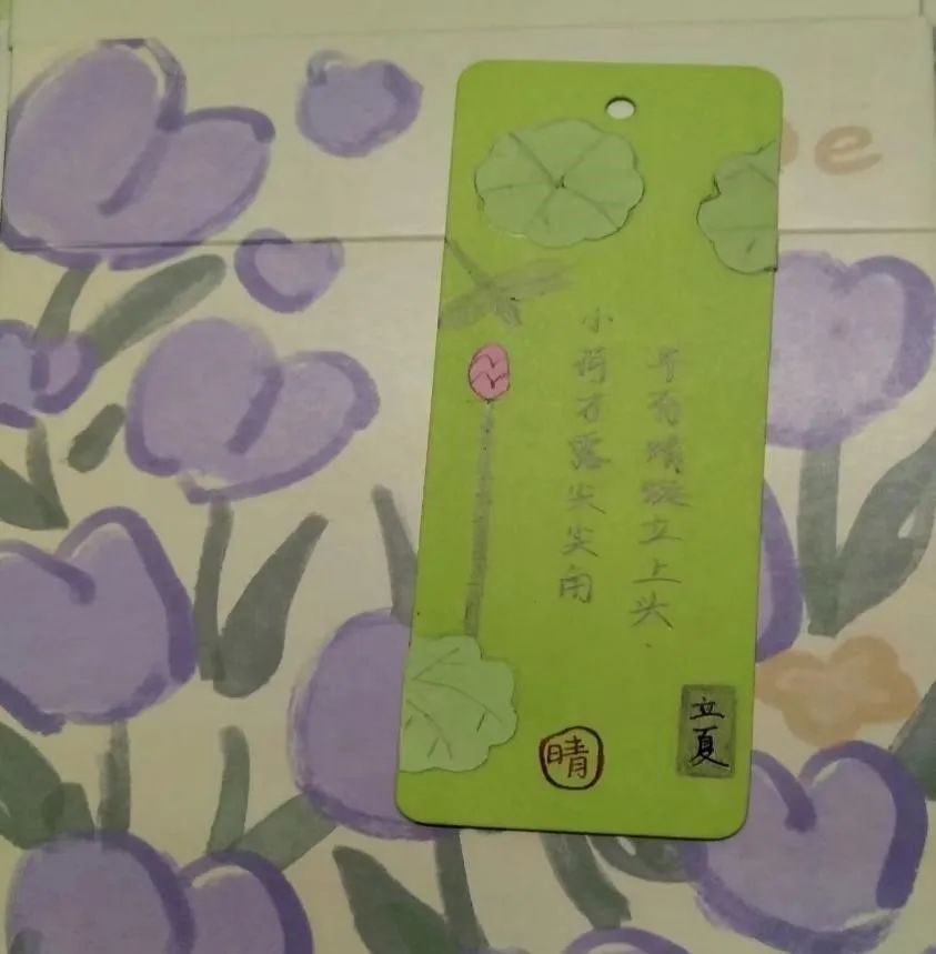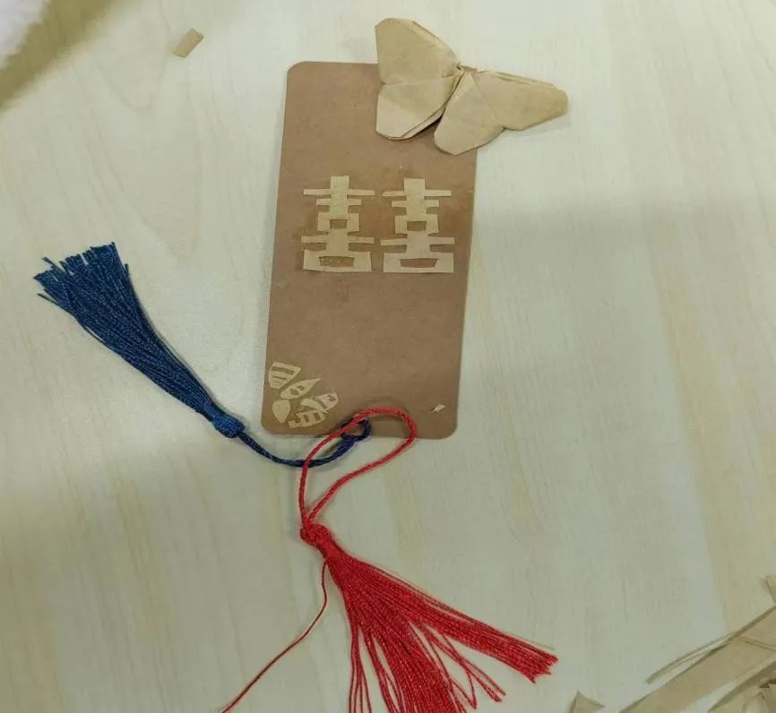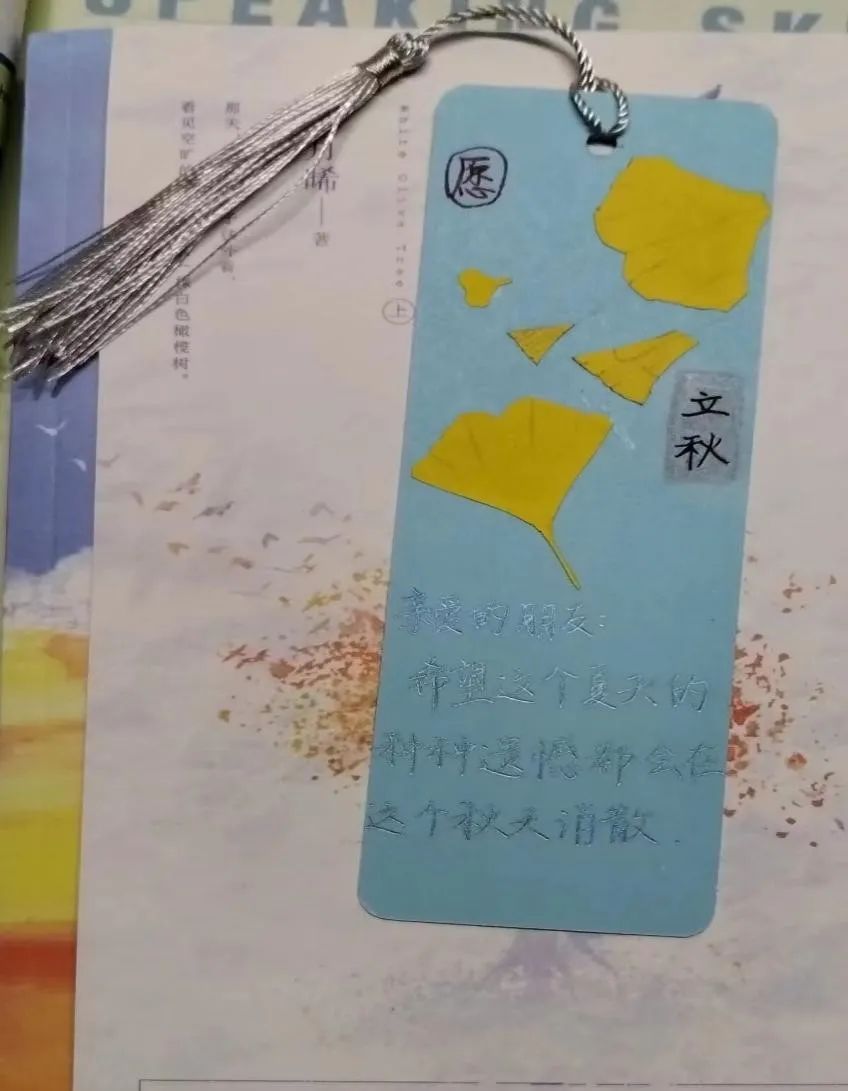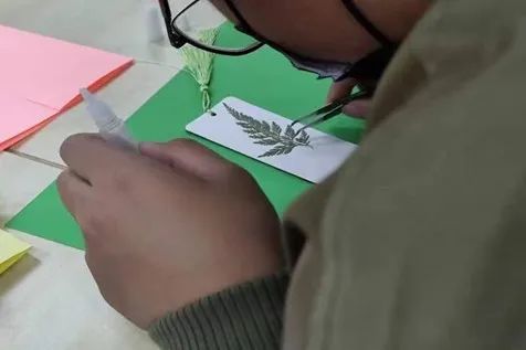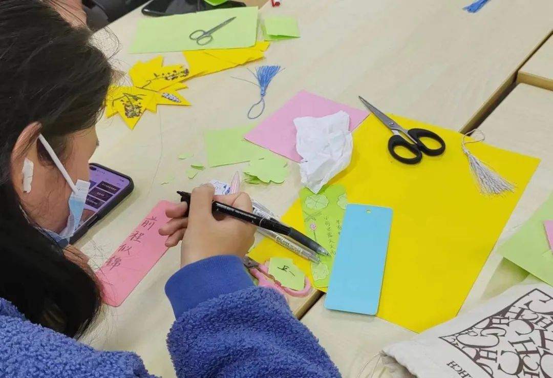 活动过程中,同学们以树叶、彩纸等材料拼成不同的图案装点在小小的书签上,生动有趣又诗情画意,承载着大大小小的心愿与热爱。