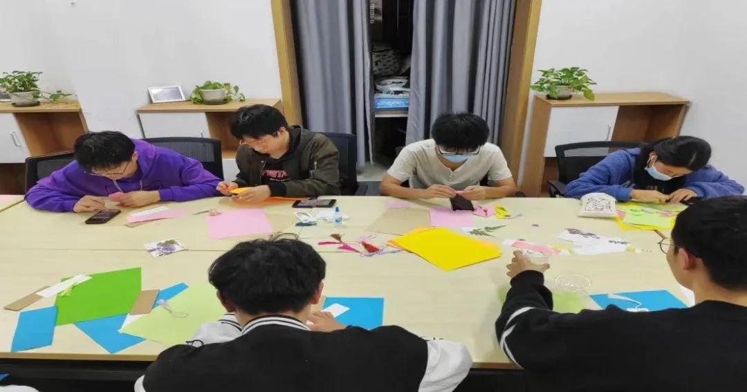 活动开始,负责人为同学们准备了不同颜色的卡纸与植物花朵树叶,讲解了活动的规则与书签的制作方式,让参与活动的同学们尽可能地发挥自己才能,创造出属于自己的秋日书签。