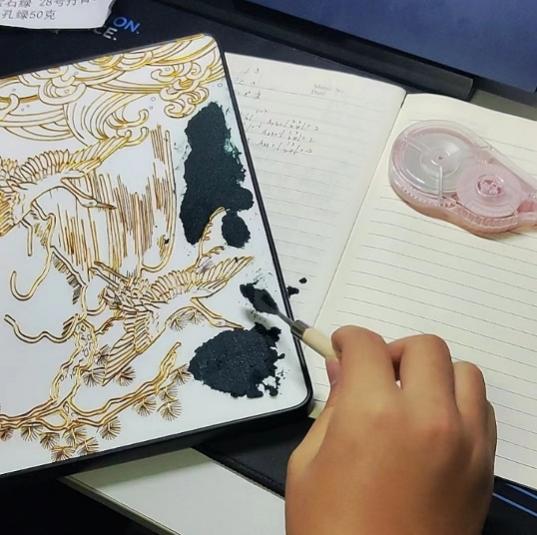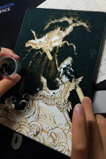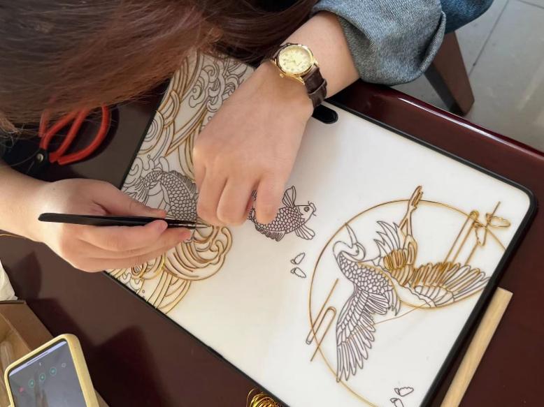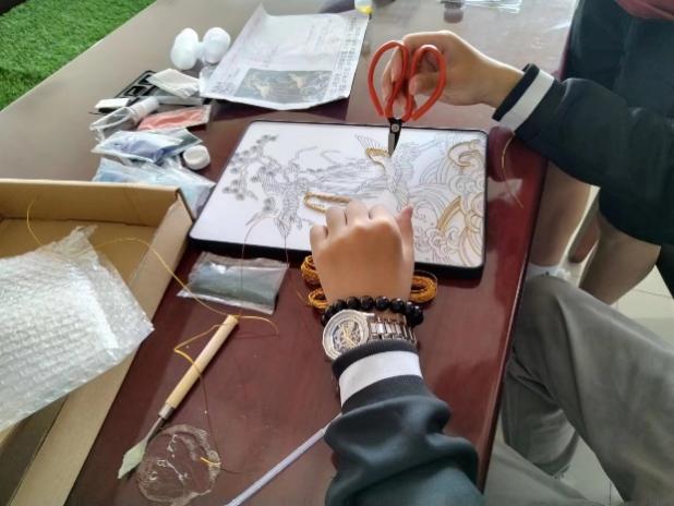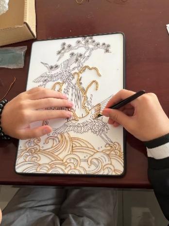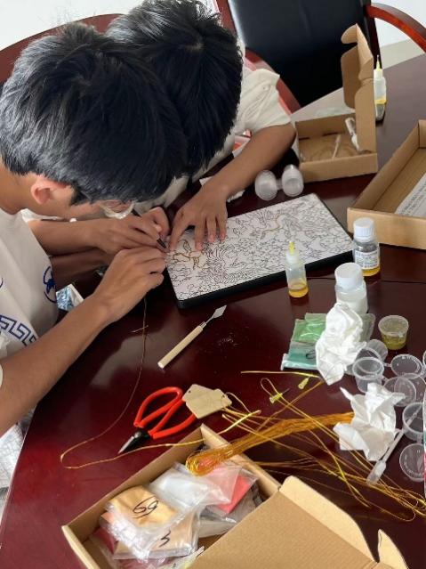 考虑到制作的难度,我们以两人为一组,共同制作一份作品。两位同学在掐丝的过程中,一个负责剪丝和粘胶水,另一位则负责根据已有线条来勾勒外形。大家在分工协作中增进了默契,在精雕细琢中平复了情绪;由于造型的复杂,在鱼鳞和仙鹤羽毛的掐丝上,极大地锻炼了同学们的专注力和耐心。