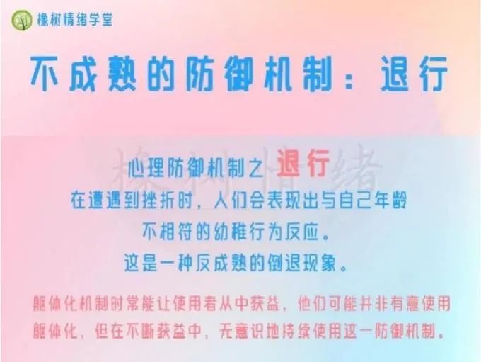 1.退行:退行就是人的一种心理防御机制,指的是当人们遇到挫折的时候,放弃已经习惯了的成人方式,恢复使用个体早年时期的行为方式来逃避现实。