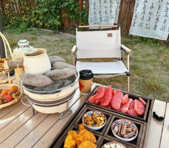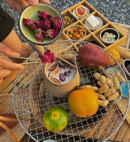 围炉煮茶,以中国传统茶文化为载体,用一炉热火簇拥起阵阵暖意;然后用在秋天收获的各式水果和坚果来烤出幸福的香气。沏水,冲泡,再添上几朵花茶和一盅牛奶,空气弥散出馥郁的奶香味;再分汤,品茗,一切都那么自然,能够让人不约而同的把心柔下来,于快节奏中抽离,享这片刻静谧。好友相伴,围出一方天地,自是轻松自在。