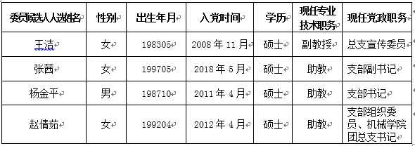 根据《中国共产党章程》和《中国共产党普通高等学校基层组织工作条例》的有关规定,ylzzcom永利总站线路检测党总支第六党支部经过支委会讨论、党员提名等形式进行充分酝酿,初步产生了4名委员候选人。现将产生的支部委员候选人(以姓氏笔画排序)予以公示,广泛听取党员群众意见。