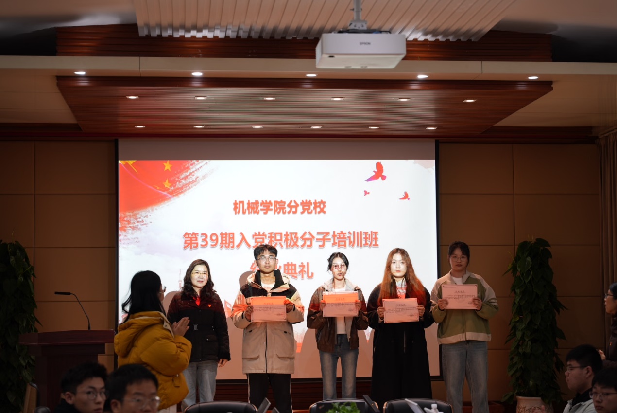 第39期入党积极分子培训班结业典礼由学院党委组织员黄金主持,会上,学院党委书记刘俊为入党积极分子优秀学员颁发结业证书,并寄语入党积极分子在结业后,应继续以党员的标准严格要求自己,在专业学习、课程实践、社会服务等方面起到示范引领作用,持续加强学习党的先进理论,保持学习热情,从理论知识中获取精神力量。